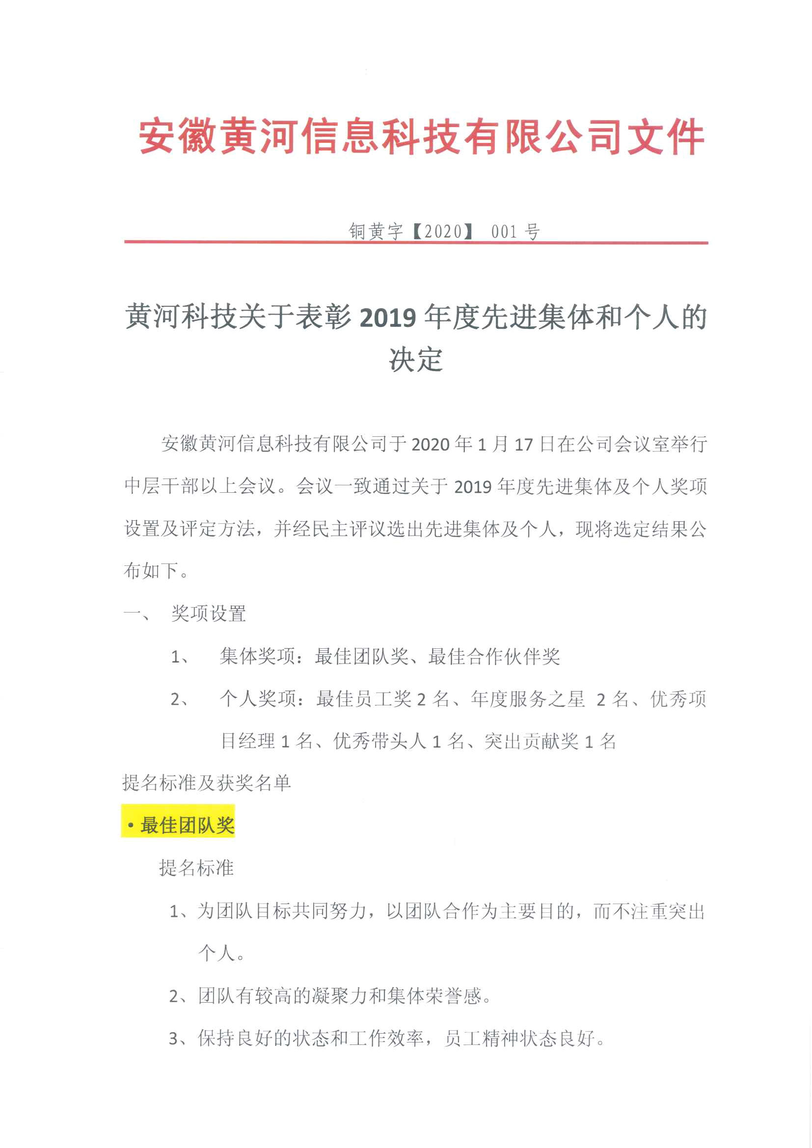 黃河科技關(guān)于表彰2019年度先進(jìn)集體和個人的決定文件